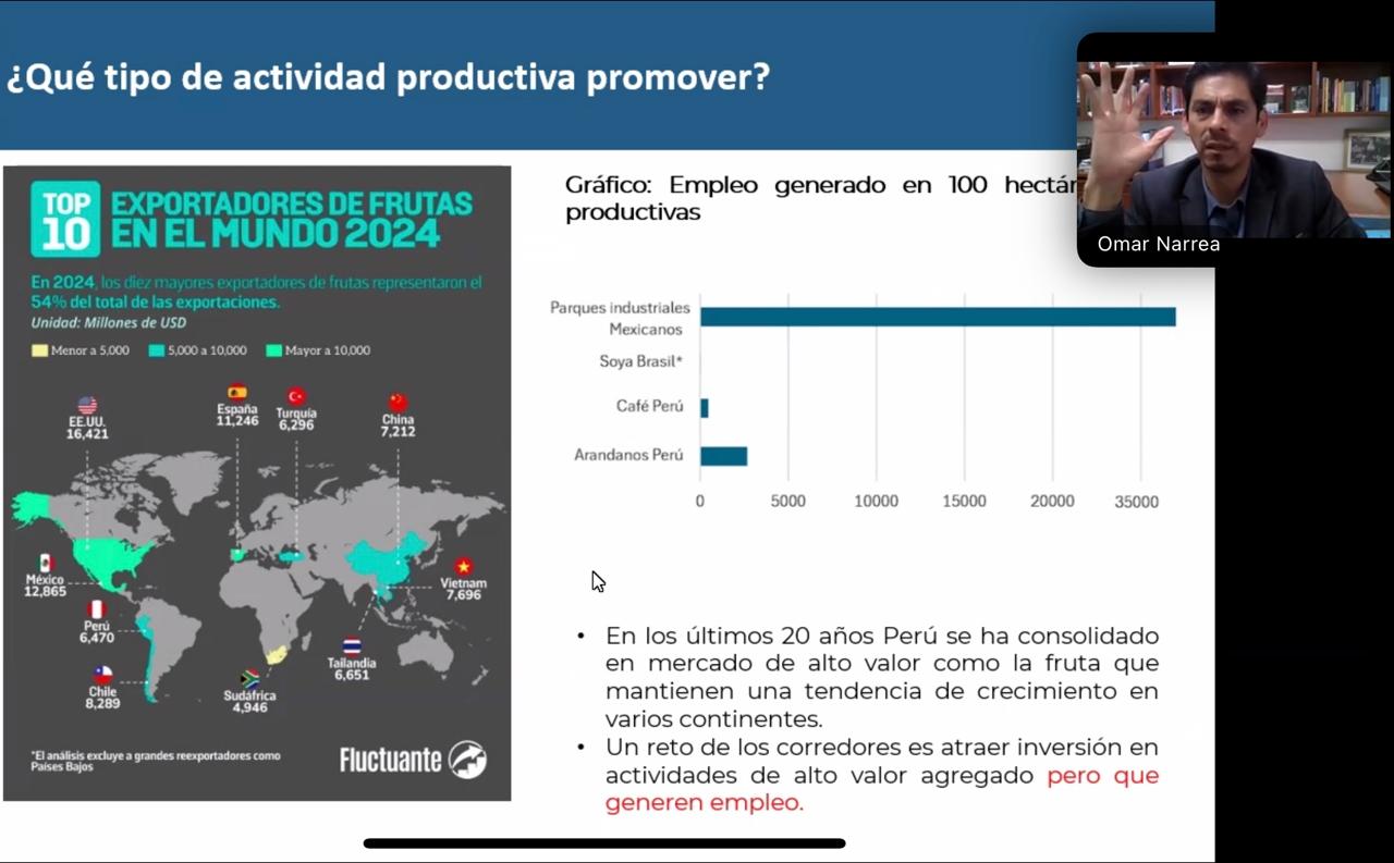 The conference was structured into four thematic panels. Researcher Omar Narrea participated in the first panel, titled “Megaprojects and Regional Governance: Can Chancay Articulate an Andean and Latin American Vision of Development?”. In his presentation, Dr. Narrea highlighted the role of the Port of Chancay as a new logistics hub for the west coast of South America. He then analyzed the economic corridors toward the Pacific Ocean and explained the transpacific Chancay-Shanghai route. He also presented the West Coast South America (WCSA) port network, which will be integrated with Chancay, strengthening the exports to Asia and promoting intra-South American trade through feeder routes. From an Andean and Latin American perspective, he emphasized that Peru has consolidated its position in high-value markets, especially in the fruit sector, and that one of the main challenges will be to attract investment in high-value-added activities that generate employment and promote productive diversification.