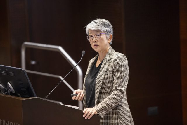 La Dra. Katada, en su exposición “Japan–US Relations and Their Implications for Latin America”, analizó la política comercial estadounidense y su impacto en Japón y América Latina, destacando las medidas arancelarias implementadas durante la administración de Donald Trump, la gobernanza global y la reconfiguración del orden económico bajo el enfoque del America First.
