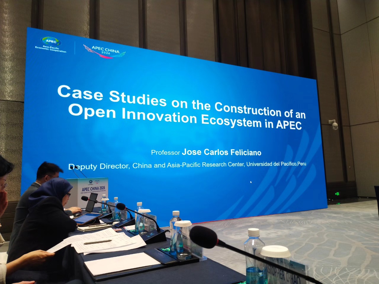 Durante su intervención, José Carlos Feliciano presentó el tema “Case Studies on the Construction of an Open Innovation Ecosystem in APEC”, en el que abordó el concepto de ecosistema de innovación abierta desde una perspectiva multisectorial, destacando la interacción entre gobierno, sector privado, academia y sociedad civil. Su presentación incluyó el análisis de estudios de caso provenientes de economías de APEC como Australia, Singapur, Perú y China, que ilustran distintos enfoques para fomentar la innovación abierta mediante la circulación transfronteriza del conocimiento, el uso de plataformas digitales, la portabilidad de datos, los desafíos de sostenibilidad y la cooperación internacional en ciencia y tecnología.
