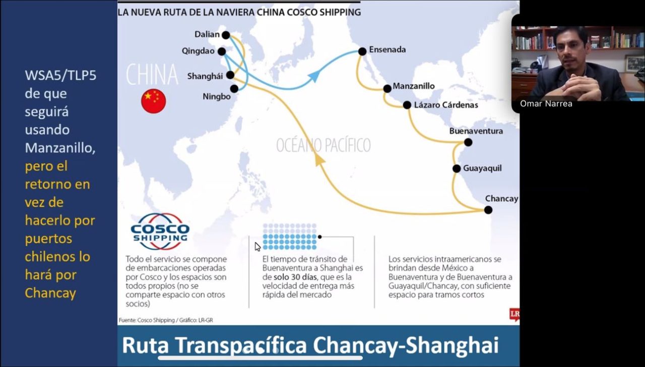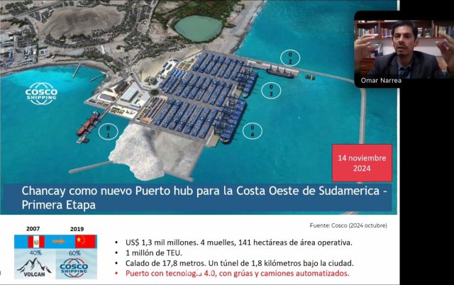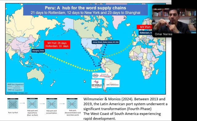 La conferencia se estructuró en cuatro bloques temáticos. El investigador Omar Narrea participó en el primer bloque, titulado “Megaproyectos y Gobernanza Regional: ¿Puede Chancay articular una visión andina y latinoamericana de desarrollo?”. En su exposición, el Dr. Narrea destacó el papel del Puerto de Chancay como nuevo hub logístico para la costa oeste de Sudamérica. A continuación, analizó los corredores económicos hacia el Pacífico y explicó la ruta transpacífica Chancay–Shanghái. Además, presentó la red de puertos sudamericanos (WCSA) que se articulará con Chancay, fortaleciendo las exportaciones hacia Asia y promoviendo el comercio intra-sudamericano mediante rutas alimentadoras. Desde una perspectiva andina y latinoamericana, subrayó que el Perú se ha consolidado en mercados de alto valor, especialmente en el sector frutícola, y que uno de los principales retos será atraer inversiones en actividades de alto valor agregado que generen empleo y diversificación productiva.
